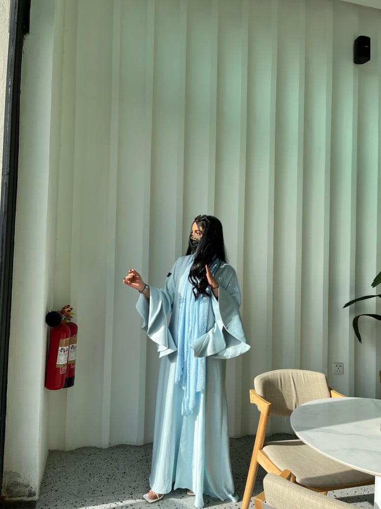 عبايه ملونه باكمام فرنسيه وقماش كريب استرتش صيفيه اللون سماوي